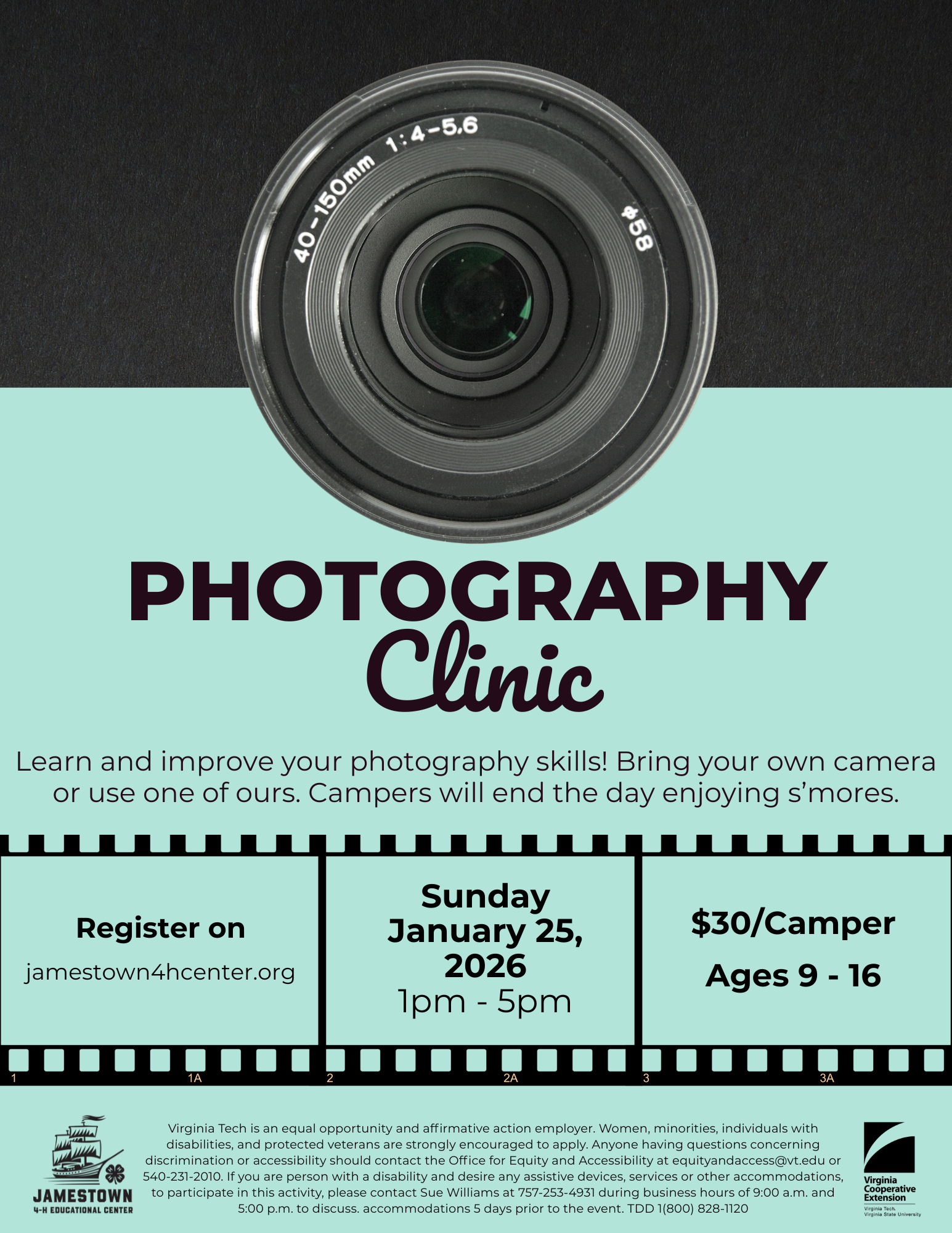 The Photography Clinic at Jamestown 4-H Educational Center offers campers the opportunity to explore photography in a fun and supportive setting. This clinic encourages creativity, curiosity, and confidence behind the lens! Campers may bring their own camera or use one provided by the center. The day concludes with a relaxing campfire and s’mores, giving campers a chance to share their favorite shots and enjoy time with friends.